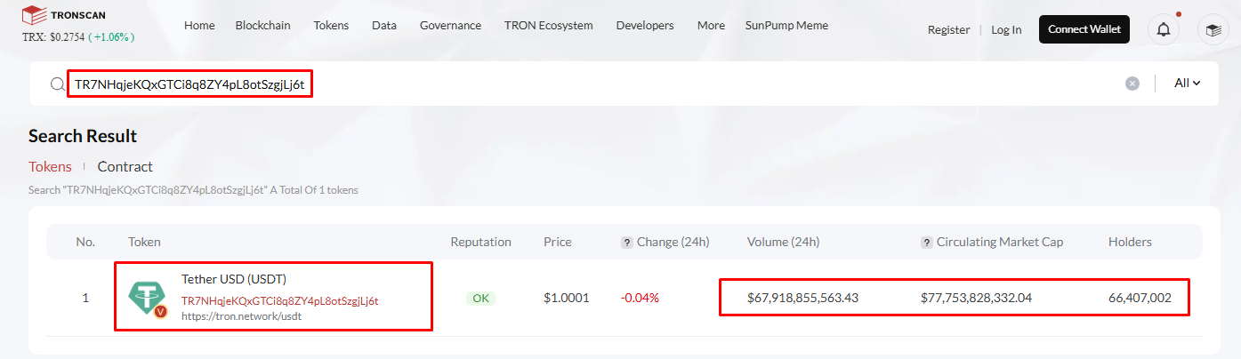 • Compare the smart contract address listed for USDT-TRX with the corresponding blockchain explorer data.