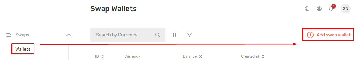 1. Navigate: "Swaps → Wallets" → Add swap wallet.