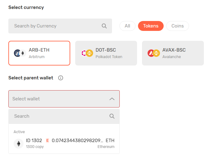 "For tokens": Link a parent wallet - main wallet from which funds are drawn to cover transaction fees or to collect tokens from deposit addresses